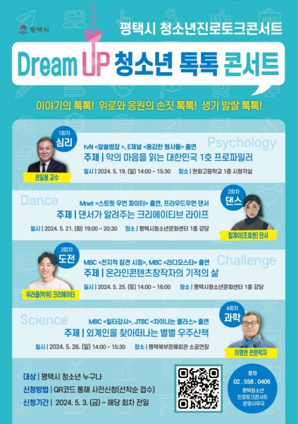 [금요저널] 평택시는 다가오는 청소년의 날을 기념해 5월 19일부터 26일까지 총 4회의 ‘평택시 청소년진로토크콘서트: Dream UP 청소년 톡톡 콘서트’를 개최한다.