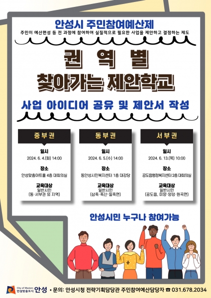 ‘권역별 찾아가는 제안학교’는 주민참여예산제 시민 교육의 일환으로 추진되며 시는 3개 권역에서 각 1회씩 교육을 진행할 계획이다.