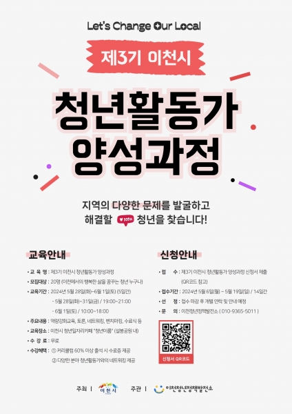 청년활동가 양성 과정은 각 분야의 전문가를 초청해 다채로운 커리큘럼을 진행해 지역문제에 관심있는 청년들을‘청년활동가’로 양성하고 청년들이 직접 지역 문제를 발굴·해결하며 다양한 분야에 역량을 갖춘 청년 리더로 양성하고자 이천시의 지원을 받아 오는 5월 28일부터 6월 1일까지 5일간 청년일자리카페 ‘청년e-room’에서 진행한다.