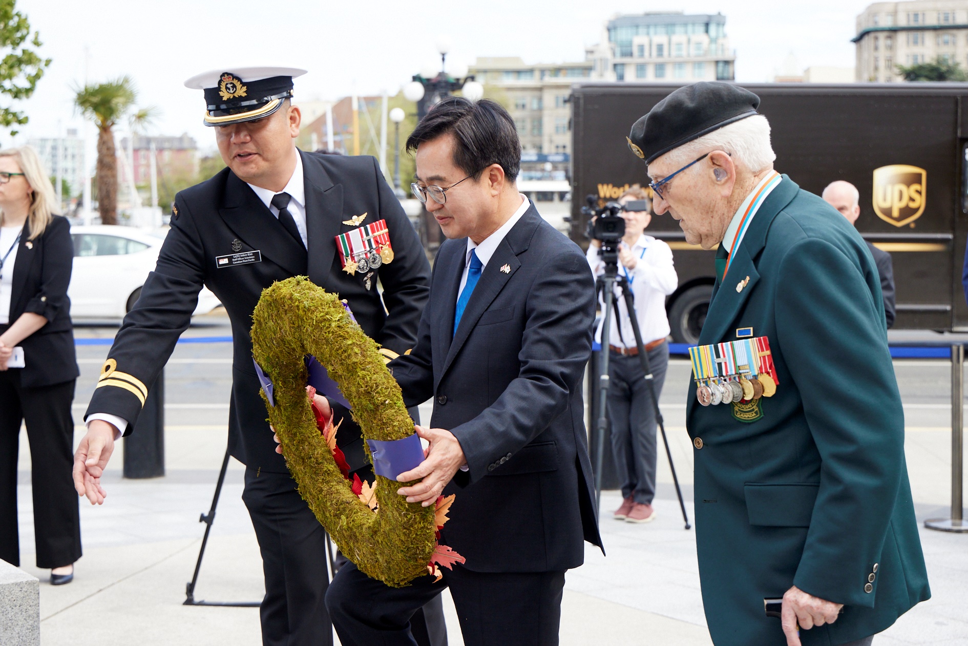 김 지사는 조찬에 이어 전쟁기념비에 헌화한 후 다섯 명의 캐나다 출신 한국전쟁 참전용사를 만나 감사의 뜻을 표하고 선물을 증정했다. 김 지사의 이번 방문에 대해 BC주는 의회 앞 기념비 헌화, 원주민 환영 의식 등 최상의예우를 제공해 눈길을 끌었다. 특히 영국 왕실에만 제한적으로 공개하는 총독 관저(Government House)에 김 지사를 초대하는 등 국빈급에 준하는 이례적 환대를 베풀었다.