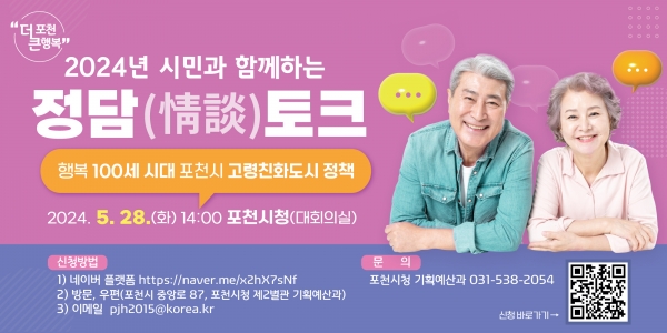 정담토크 신청은 노인 정책 분야에 관심 있는 시민이라면 성별, 연령, 직업에 상관 없이 가능하며 오는 24일까지 네이버 폼 또는 포천시 중앙로 87, 포천시청 제2별관 기획예산과에 방문하거나 우편을 통해 신청하면 된다.