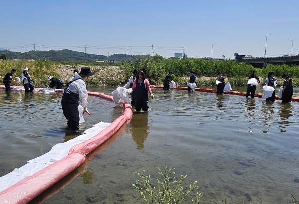 훈련에서는 오염물질 확산 차단을 위한 오일펜스·흡착붐 설치, 흡착제를 이용한 유류제거 작업 등 상황 발생 즉시 방제 조치하기 위한 현장 대응훈련과 사후 관리 등 수질오염사고 전반에 대한 대응 프로세스 교육을 병행했다.