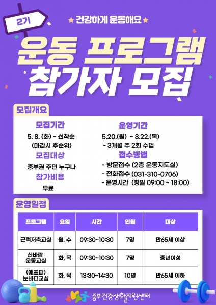 [금요저널] 시흥시 보건소 중부건강생활지원센터는 중부권 지역주민의 건강관리와 신체활동 활성화를 위해 맞춤형 운동프로그램을 운영하며 2기 참여자를 5월 13일부터 모집하고 있다.