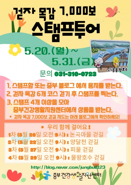 [금요저널] 시흥시 중부건강생활지원센터는 걷기 행사인 ‘걷자 목감 7,000보 스탬프투어’를 오는 20일부터 31일까지 개최한다.