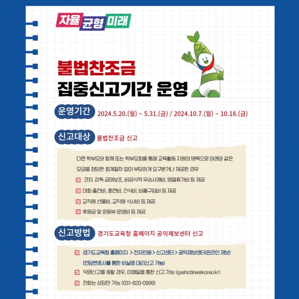 [금요저널] 경기도교육청은 공정하고 투명한 경기교육의 가치를 실현하기 위해 부패취약분야별 집중신고기간을 운영한다.