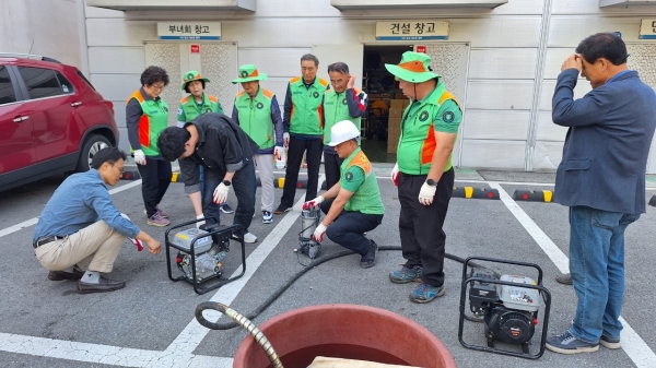 이날 자율방재단은 집중호우로 인한 침수 피해 발생 시 신속한 조치가 이루어질 수 있도록 양수기 및 수중펌프의 가동 상태를 점검하고 시연했다.