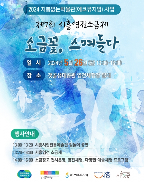 [금요저널] 시흥시는 지붕 없는 박물관 사업의 하나로 오는 5월 26일 오후 1시부터 시흥갯골생태공원 내 염전 체험장 일대에서 ‘2024 제7회 시흥염전 소금제-소금꽃, 스며들다’를 개최한다.