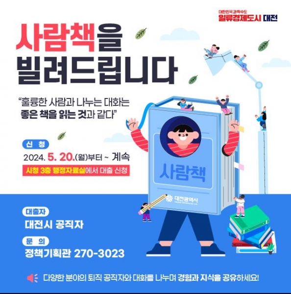 대전시의‘사람책 도서관’은 유능한 퇴직 공직자를 책처럼 활용하도록 만든 시범사업으로 기획, 토목, 교통, 국제행사, 인사, 조직 생활, 민원 대응 분야에서 공개모집을 통해 5급 이상 퇴직 공직자 13명을 선정했다.