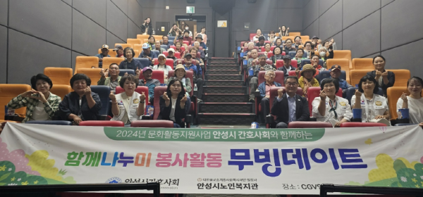 안성시간호사회의 지원으로 신체 및 경제적 이유 등으로 문화 활동의 기회가 제한적인 취약계층 어르신들에게 문화 체험의 기회와 복지 향상을 목적으로 기획됐으며 복지관 이용 어르신 40명은 영화 “스턴트맨”을 관람하며 즐거운 시간을 보냈다.