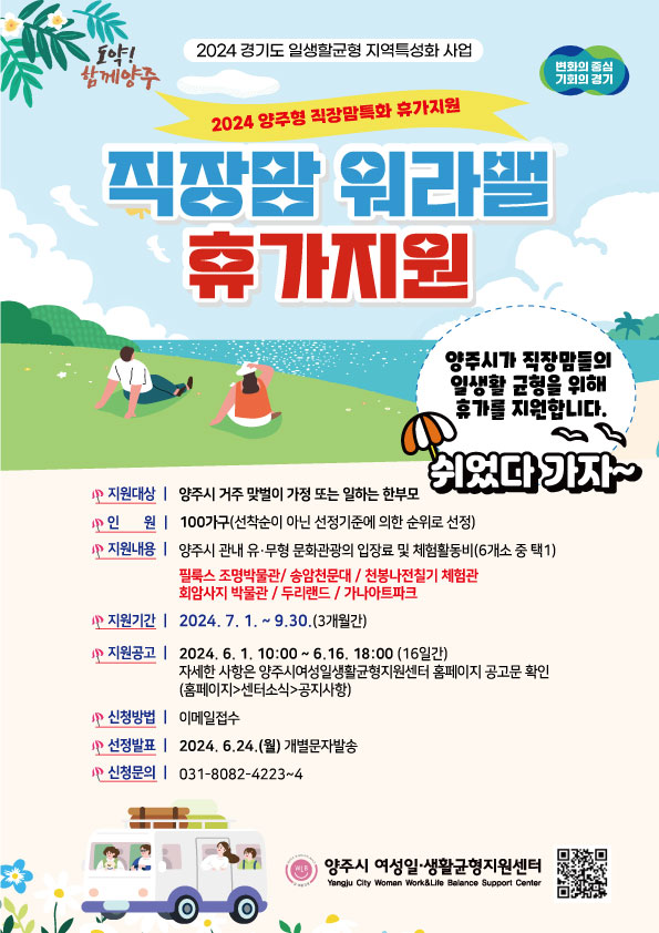 [금요저널] 양주시는 여성일·생활균형지원센터에서 오는 6월 1일부터 6월 16일까지 ‘직장맘 워라밸 휴가지원’사업에 참여할 맞벌이 직장맘 및 일하는 한부모 가정 100가구를 모집한다고 밝혔다.