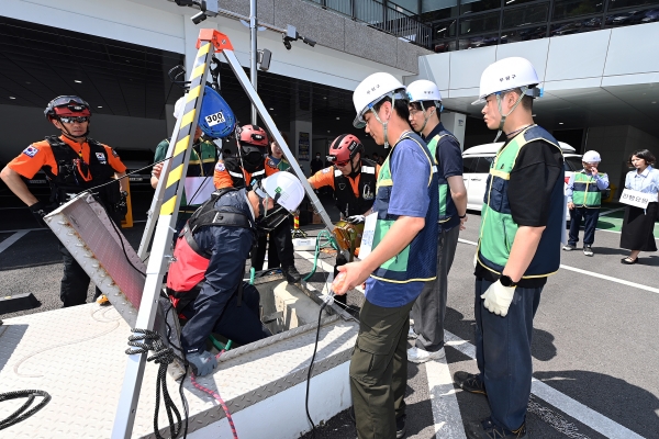 이 곳에서 복합가스측정기·공기호흡기·송기마스크·삼각대 등을 활용한 긴급구조작업과 심폐소생술을 훈련함으로써 사고대응 역량을 기르는 데 초점을 맞췄다.