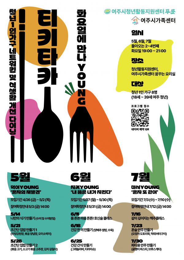 [금요저널] 여주시 청년활동지원센터는 오는 6월, 여주시 1인가구 청년들을 위한 네트워킹 및 식생활 다이닝 프로그램 ‘티키타카 : 화요일에 만나영’을 진행한다고 밝혔다.
