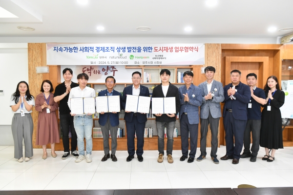 이번 협약식에는 강수현 시장을 비롯해 양주시 균형발전국장, 도시재생과장, 도시재생지원센터장 등 관계 간부 공무원과 협약기관인 ㈜네이처라우드, 햇품 주식회사 및 최호성 양주시 도시재생 주민협의체 대표 등이 참석했다.