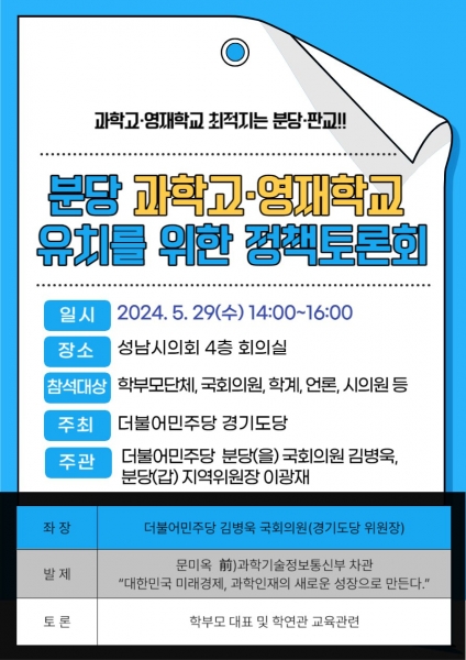 [금요저널] 김병욱 국회의원이 오는 29일 오후 2시 성남시의회 4층 회의실에서 ‘분당 과학고·영재학교 유치를 위한 정책토론회’를 개최한다.