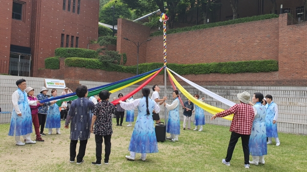 25일 행사는 △기둥을 중심으로 색색의 끈들을 잡고 도는 단심줄놀이 △음악에 맞춰 대접, 접시, 쳇바퀴 등을 막대로 돌리며 재주를 부리는 버나 놀이 △오래 건강하게 살자는 염원을 담은 오색실로 만든 팔찌인 장명루 만들기 체험 등으로 구성됐다.