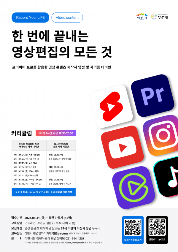 영상 촬영 및 편집 자격증 준비와 함께 짧은 길이의 영상 제작 방법을 습득하는 본 과정은 5월 31일부터 19세 이상 39세 이하의 이천시 청년 누구나 QR코드를 통해 신청할 수 있으며 6월 20일 첫 과정을 개강한다.