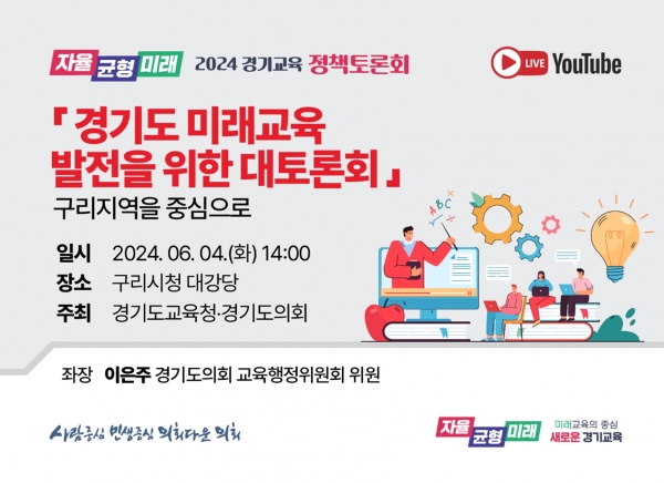 [금요저널] 경기도의회 교육행정위원회 이은주 의원은 다음달 4일 오후 2시 구리시청 대강당에서 구리지역을 중심으로 한 경기도 미래교육 발전을 위한 대토론회를 개최한다고 29일 밝혔다.
