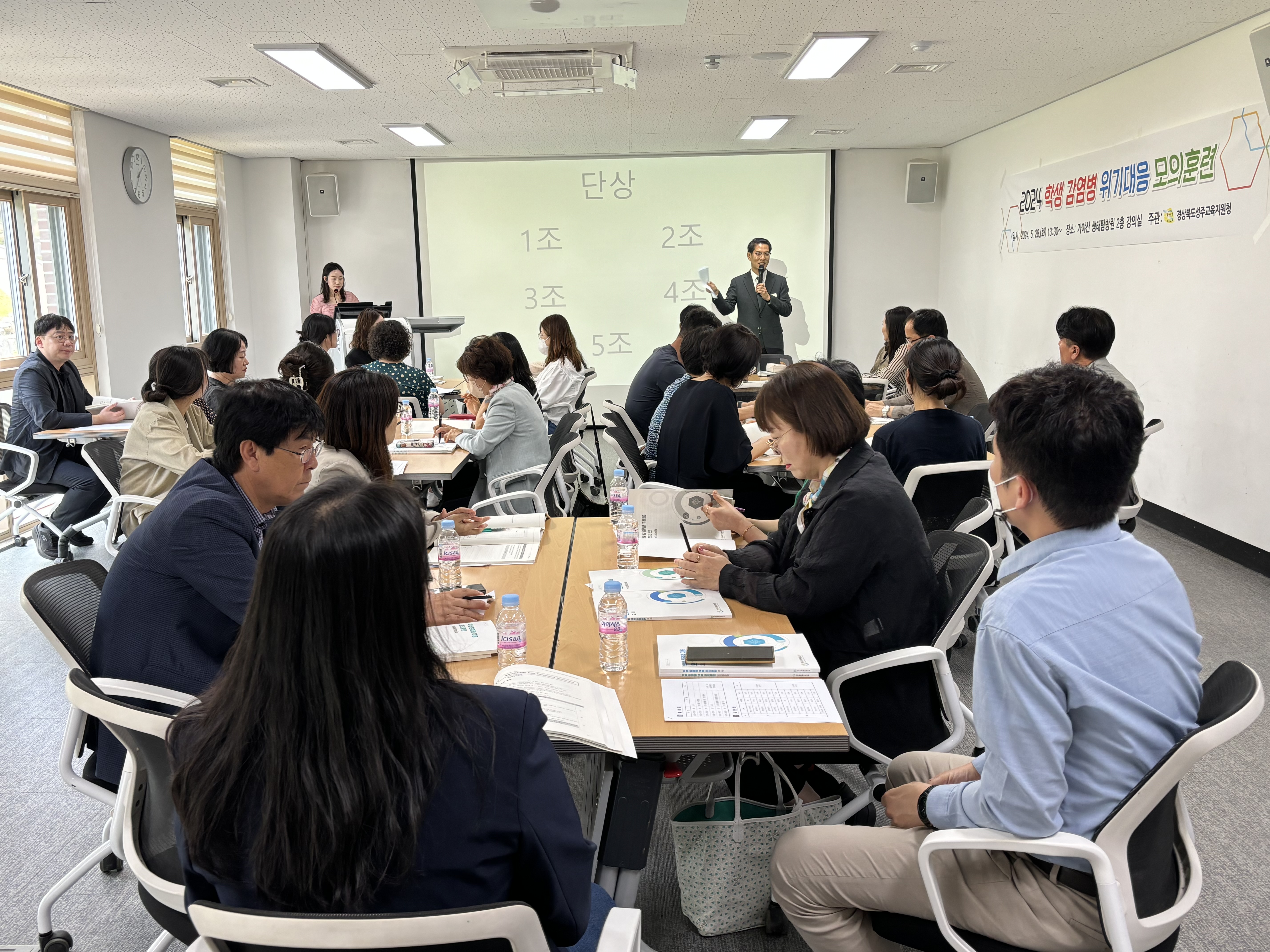 □ 경상북도성주교육지원청(교육장 채종원)은 학교 내 감염병 발생에 따른 신속하고 체계적인 대응 역량 강화를 위해 5월 28일(화) 관내 초·중·고 교장 및 교감, 교사, 행정실장 등 30여명을 대상으로 학교 감염병 위기대응 모의훈련을 실시하였다.