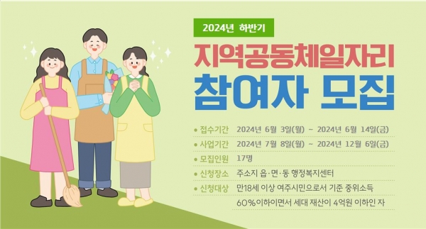 [금요저널] 여주시가 오는 2024년 6월 3일부터 14일까지 취업취약계층을 위한 ‘2024년 하반기 지역공동체일자리사업’ 참여자를 모집한다.
