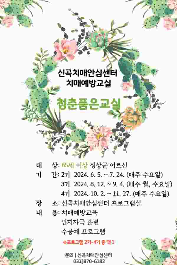 각 기수 모두 오후 2시부터 3시 30분까지 8회기씩 신곡치매안심센터 프로그램실에서 운영한다.