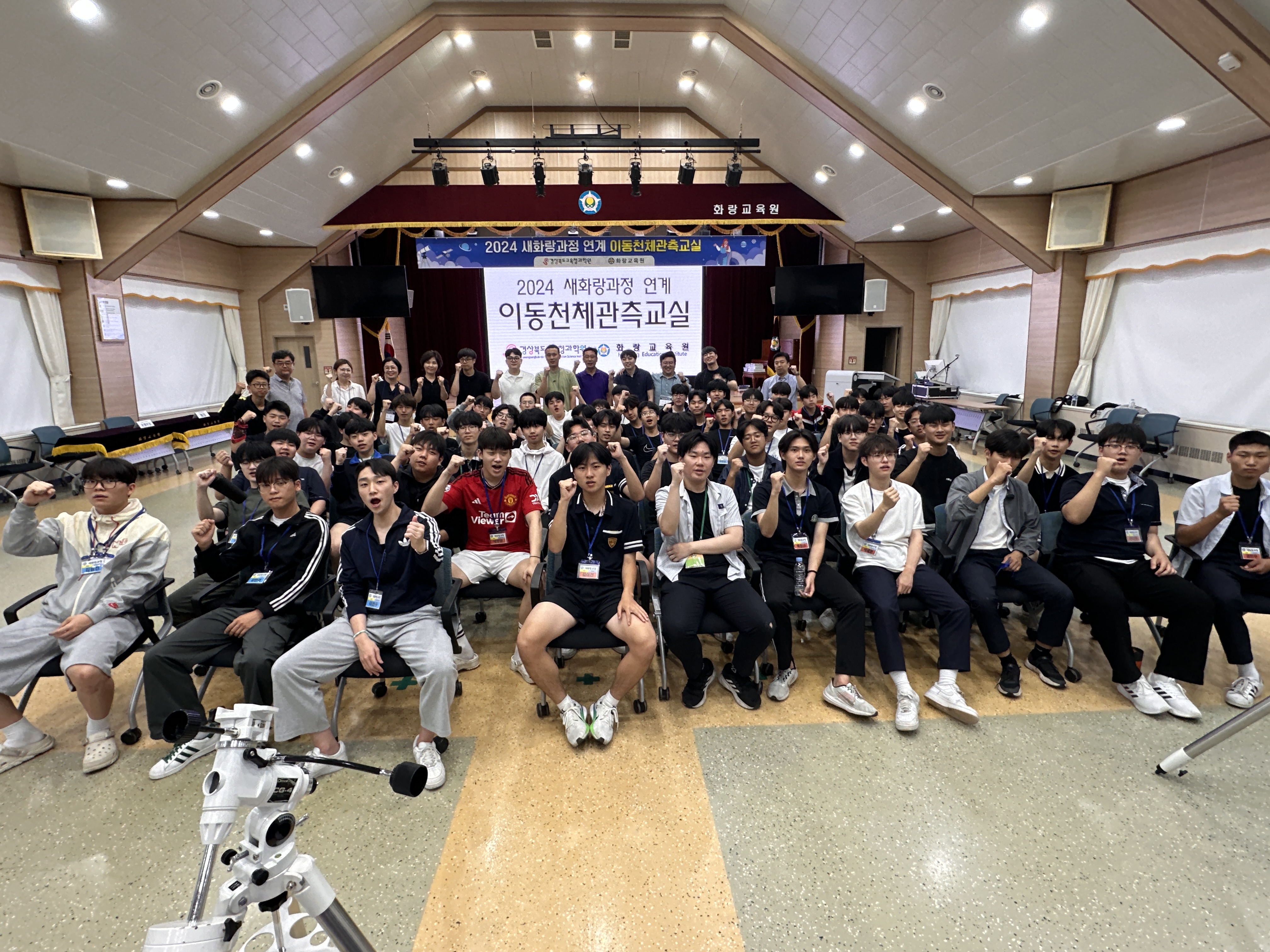 경상북도교육청과학원(원장 진재서)은 5월 29일(수)에 화랑교육원에서 50개교 62명의 고등학생을 대상으로 2024 이동천체관측교실을 실시하였다. 본 천체관측교실은 경상북도교육청 직속기관인 경상북도교육청과학원과 화랑교육원 두 기관이 연계하여 실시한 연합 프로그램이다. 경상북도교육청과학원의 교육용 천체망원경, 이동식 천체투영기를 들고 화랑교육원을 찾아 새화랑과정 참가 고등학생들을 대상으로 교육활동을 실시하였다. 올해는 초・중학교 방문 및 화랑교육원 새화랑과정 협업 프로그램을 포함하여 화랑교육원에서 프로그램을 운영하였다.