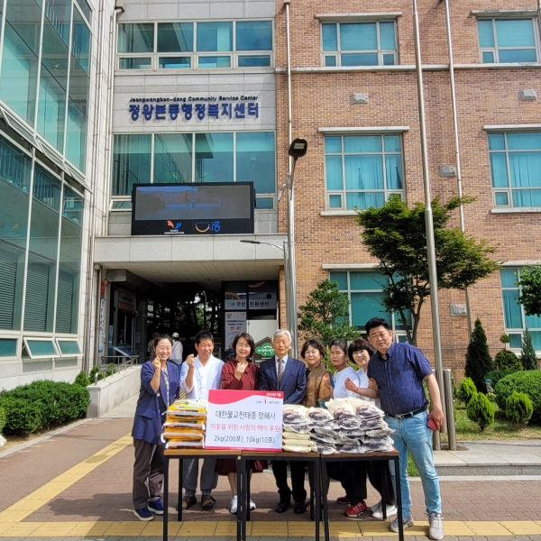 [금요저널] 시흥시 정왕본동에 있는 대한불교천태종 정혜사는 지난 30일 정왕본동 행정복지센터에 방문해 지역사회 내 생활이 어려운 외국인 가구, 1인 가구, 한부모 가구 등 이웃을 돕기 위해 2kg짜리 백미 200포, 10kg짜리 백미 10포를 전달했다.