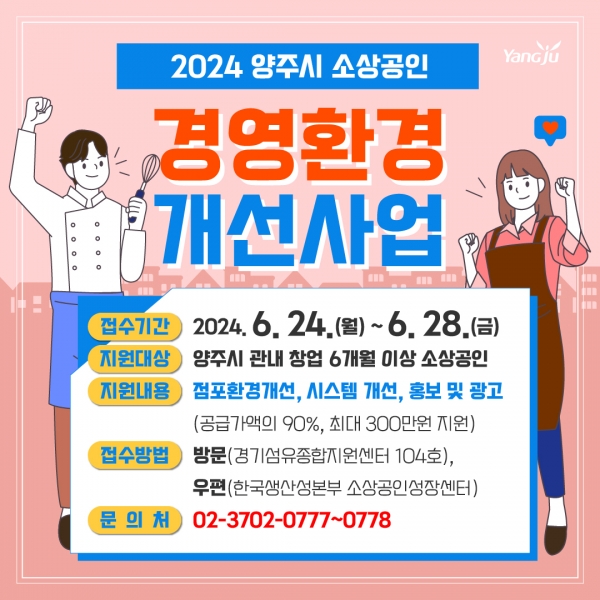 [금요저널] 양주시는 고물가, 고금리, 소비심리 위축 등으로 인해 경영 애로를 겪는 관내 소상공인의 경영 안정과 경쟁력 강화를 위한 ‘소상공인 경영환경개선사업’에 참여자를 모집한다.