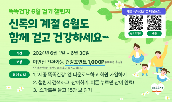 [금요저널] 세종시가 시민들의 똑똑한 건강관리를 지원하기 위해 ‘세종 똑똑건강앱’에서 15만보 걷기 챌린지를 진행한다.