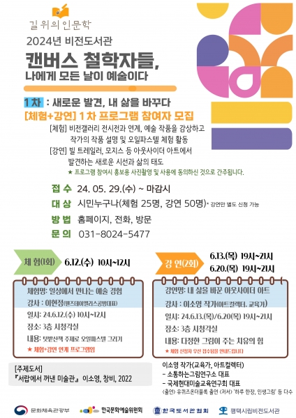 비전도서관은 문화체육관광부 주최, 한국문화예술위원회와 한국도서관협회가 공동 주관한 ‘2024년 길 위의 인문학’ 공모사업에 선정되어 ‘캔버스 철학자들, 나에게 모든 날이 예술이다’의 프로그램을 올 9월까지 총 12회차로 진행한다.