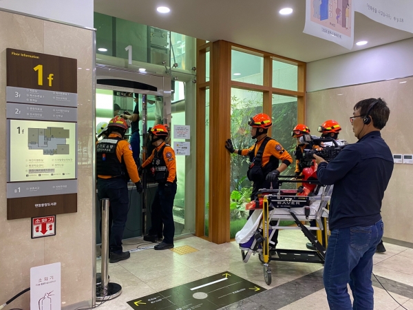 훈련은 공동주택 관리주체 및 시민 100여명이 참관한 가운데 면암중앙도서관 이용객이 승강기에 갇힌 가상의 상황을 설정해 진행했다.