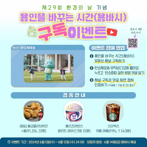 [금요저널] 용인특례시는 제29회 환경의 날을 맞아 시가 운영하는 탄소중립 유튜브 채널 ‘용바시’ 채널 구독·댓글 이벤트를 진행한다고 4일 밝혔다.