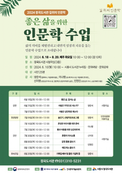이번 장곡도서관의 ‘2024년 길 위의 인문학’은 ‘좋은 삶을 위한 인문학 수업’을 주제로 철학, 심리학, 생사학 등 다양한 분야의 전문가들이 진행하는 융복합 프로그램이다.