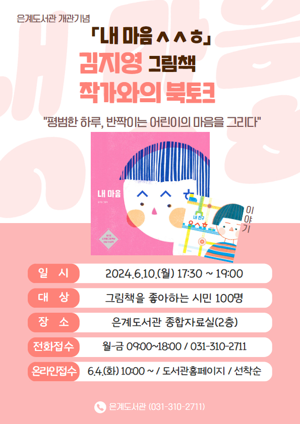 [금요저널] 시흥시 은계도서관이 6월 10일 오후 5시 30분에 은계도서관 개관 기념으로 그림책 ‘내 마음ㅅㅅㅎ’의 김지영 작가와 함께하는 북 토크를 진행한다.