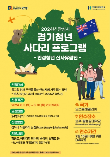 [금요저널] 안성시는 청년들에게 해외 대학 연수 경험을 제공해 배움과 진로 개척의 동기를 부여하고 미래 도전의 기회를 지원하기 위해 ‘2024년 안성시 경기청년 사다리 프로그램‘안성청년 신사유람단’’ 참여자를 오는 6월 3일부터 모집한다고 밝혔다.
