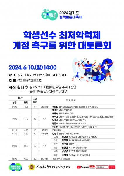 [금요저널] 황대호 경기도의회 문화체육관광위원회 부위원장이 오는 6월 10일 오후 2시에 경기과학고 컨퍼런스홀에서 ‘학생선수 최저학력제 개정 촉구를 위한 대토론회’를 개최한다.