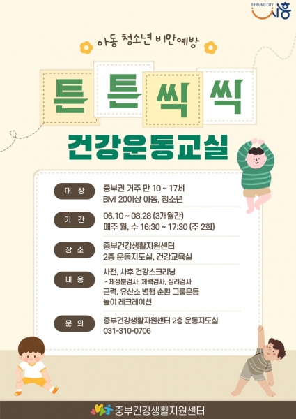 [금요저널] 시흥시 보건소 중부건강생활지원센터는 아동·청소년의 신체활동을 활성화해 과체중과 비만을 예방하기 위해 ‘튼튼씩씩 건강운동교실’을 6월 10일부터 8월 28일까지 운영한다고 밝혔다.