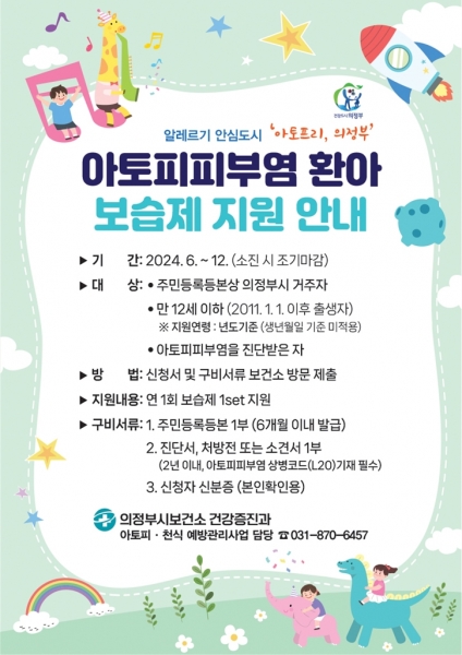 소득수준과 관계없이 의정부 시민 중 아토피피부염을 앓고 있는 12세 이하 환아는 누구나 12월까지 신청이 가능하며 소진 시 사업이 조기에 마감될 수 있다.