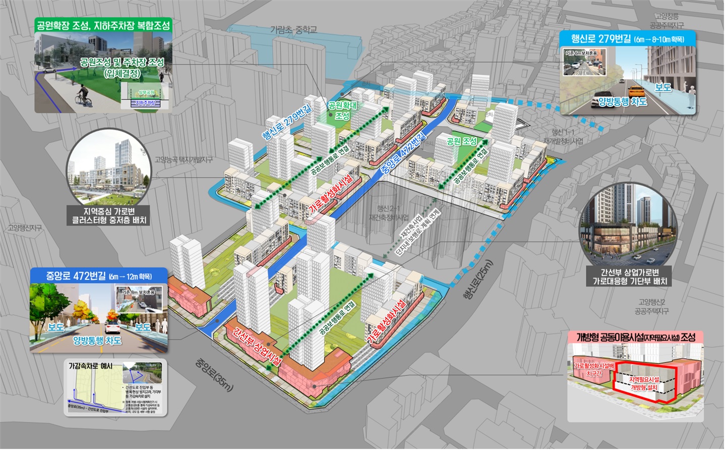 구체적 내용을 살펴보면 행신동 204-5번지 일원의 가람초등학교 남측에 위치하며 규모는 7만 9천216.5㎡다. 대상지는 대규모 아파트 단지로 둘러싸인 노후 저층주거지가 대부분으로 소규모주택정비 사업의 계획적 추진을 위해 중규모의 주택단지 조성이 가능하도록 7개 블록단위로 계획해 점진적으로 소규모주택정비 사업을 실시할 예정이다.