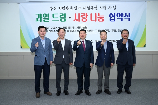 [금요저널] 구리시에서는 6월 5일 구리시 지역아동센터를 대상으로 제철과일을 지원하는 ‘과일 드림·사랑 나눔’ 신사업을 위한 구리농수산물공사와 구리농수산물도매시장 청과 도매법인, 구리농수산물도매시장 사랑나눔단의 사회공헌 협약식이 개최됐다.