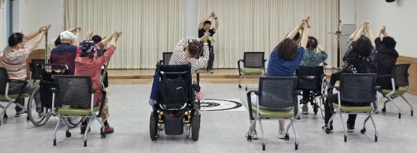이번 교육은 보행이 불편한 장애인에게 발생할 수 있는 낙상사고 위험을 감소시키기 위해 근력 강화 균형 조절 능력을 향상시켜 삶의 활력을 제공하고자 마련됐으며 낙상으로 인한 2차 장애 예방교육과 더불어 △하지 관리 운동 및 유산소 운동 △호흡 훈련을 통해 활동의 기본 갖추기 △밴드 활용 체간 근력 강화 재활 체조 등으로 진행됐다.