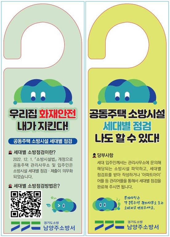 [금요저널] 남양주소방서는 2022년 12월 1일 ‘소방시설 설치 및 관리에 관한 법률’ 개정에 따라 2024년 12월 1일부터 본격 시행되는 공동주택 세대점검에 관한 내용을 입주민에게 널리 알리기 위해 관내 공동주택 관리자와 시민들을 대상으로 홍보에 나섰다.