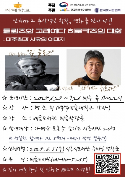 배곧도서관은 올해 ‘들뢰즈와 고레에다 히로카즈의 대화 : 마주침과 사유의 이미지’라는 주제로 프랑스 철학자 질 들뢰즈의 철학을 토대로 칸 국제 영화제에서 황금종려상을 받은 일본 명장 감독 고레에다 히로카즈 영화에 나타나는 ‘타자들’에 대해 이야기할 계획이다.