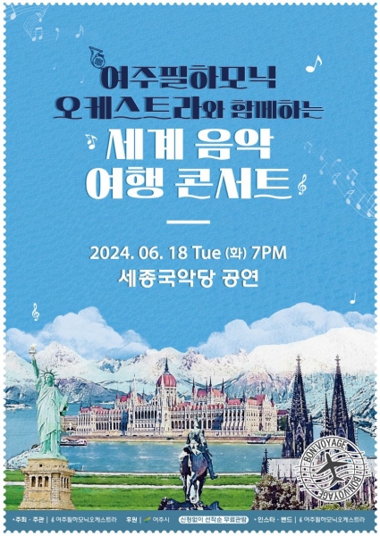 한편 여주필하모닉 오케스트라의 세계 음악 여행 콘서트는 오는 6월 18일 오후 7시 세종국악당에서 개최되며 초대권 및 입장권이 없이 누구나 무료로 입장·관람할 수 있다.