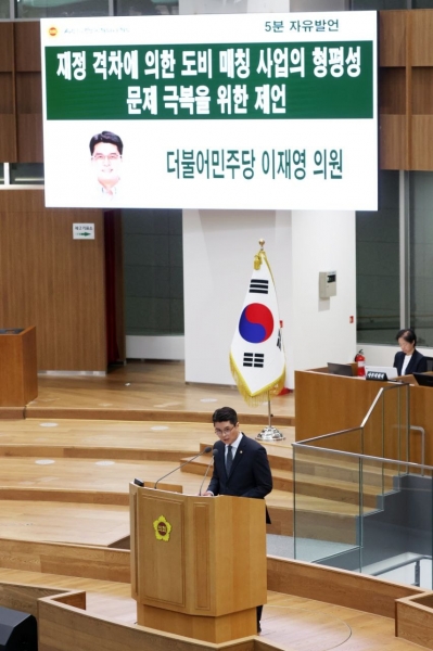 [금요저널] 경기도의회 경제노동위원회 이재영 의원은 12일 제375회 경기도의회 정례회 5분 자유발언에 나서 “재정 격차에 의한 도비 매칭 사업의 형평성 문제 극복을 위한 제언” 했다.