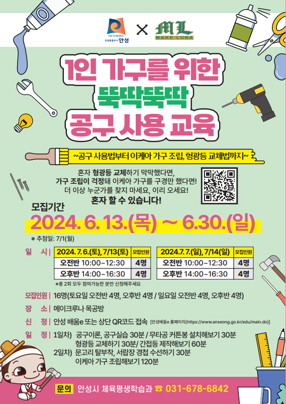 1인 가구라면 한번쯤 제대로 배워보고 싶었을 재밌고 유익한 공구 사용교육은 6월 13일부터 30일까지 안성 배움e 홈페이지에서 참여자를 모집하며 7월 1일에 추첨을 진행한다.