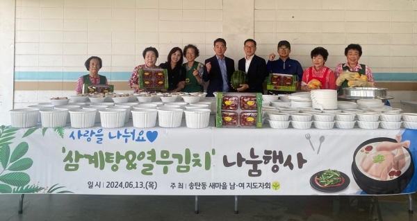 [금요저널] 평택시 송탄동 새마을 남녀 지도자회는 지난 13일 송탄동 행정복지센터에서 여름을 맞이하는 6월, 손수 준비한 재료들로 만든 삼계탕과 열무김치, 제철과일 꾸러미를 직접 만들어 전달하는 ‘사랑을 나눠요, 삼계탕 및 열무김치’ 나눔 행사를 진행했다.