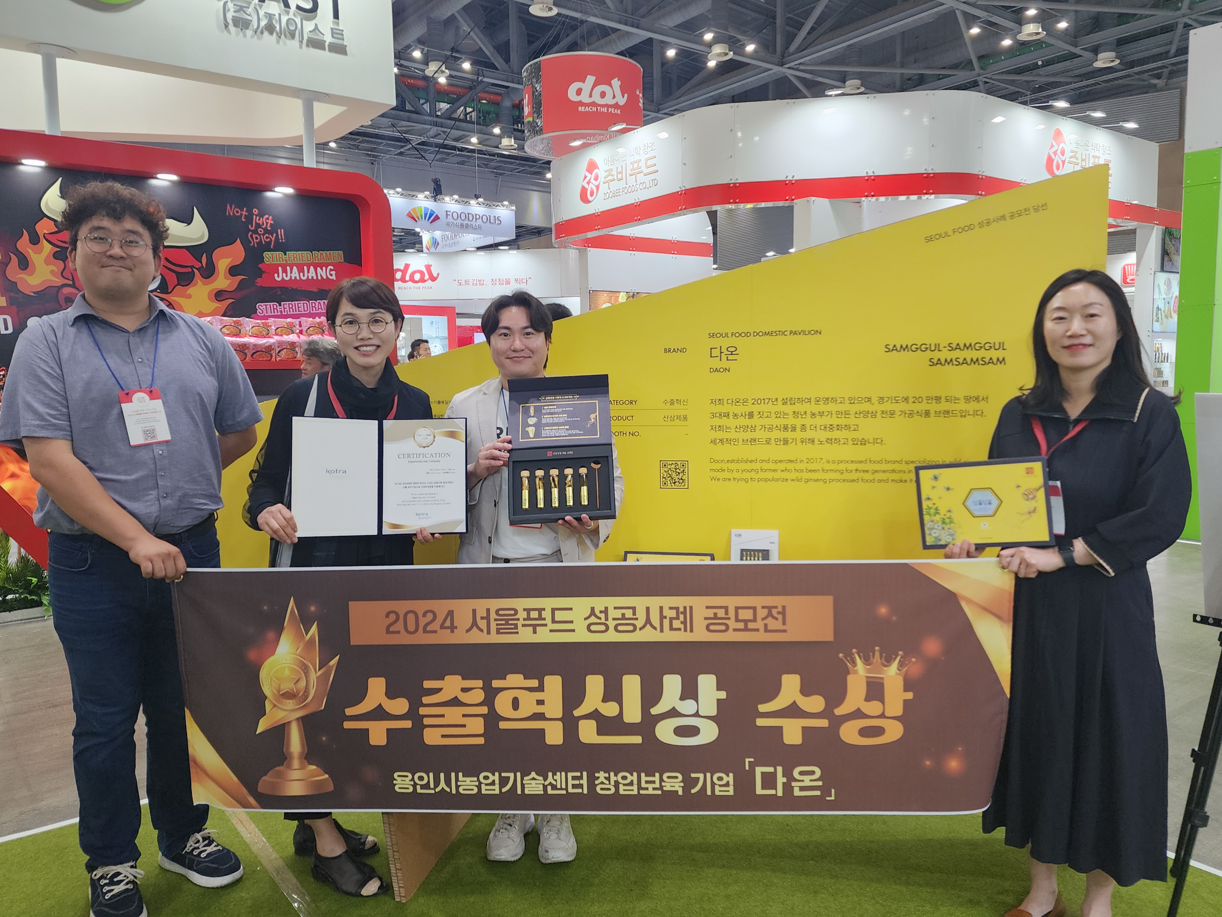 용인특례시(시장 이상일)는 시 지원을 받아 다양한 산양삼 가공식품을 개발‧판매하고 있는 농식품기업 ‘다온’(대표 박태광)이 서울국제식품산업대전(서울푸드 2024)의 수출 성공사례 공모전에서 수출혁신상을 받았다고 16일 밝혔다.