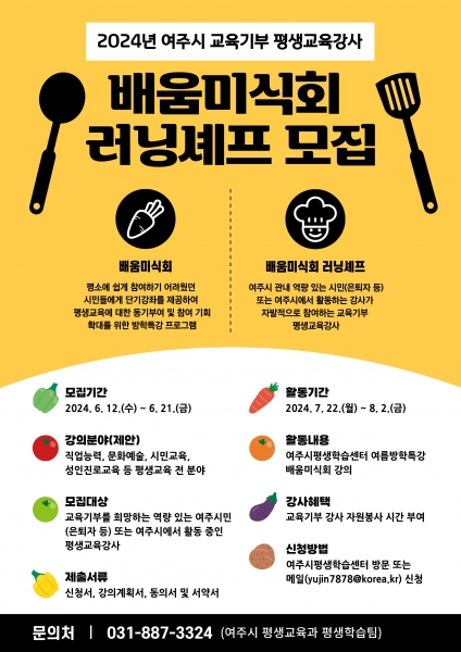 [금요저널] 여주시 평생교육과에서는 관내 역량 있는 시민 또는 여주시에서 활동하는 강사를 대상으로 교육기부 평생교육강사 ‘배움미식회 러닝셰프’를 모집한다.