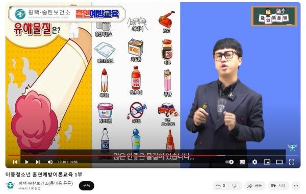 [금요저널] 평택시는 보건복지부, 국가금연지원센터 및 평택보건소에서 자체 제작한 흡연 예방 교육 영상을 어린이집, 유치원 등 각 교육기관에 지속적으로 배포하는 등 미취학아동부터 청소년까지 일상 생활공간에서 노담 문화를 조성하기 위해 지속적인 홍보를 하고 있다.