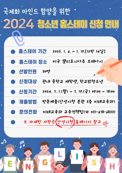2024년 청소년 홈스테이 참가 신청은 오는 7월 1일 9시부터 7월 19일 오후 6시까지 안성시청 본관 3층 미래교육과로 개별 방문 제출 방식으로 진행되며 자세한 내용은 안성시청 홈페이지에 공고되어 있다.